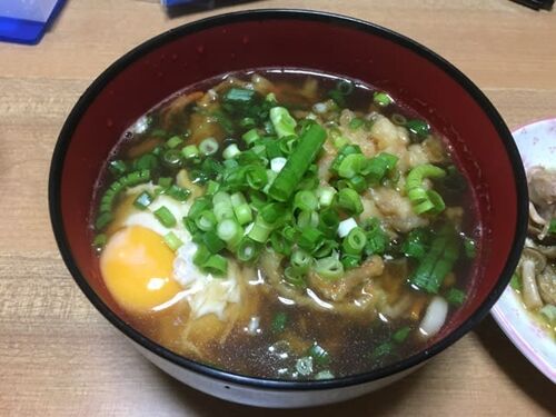 今夜は、休肝日にして晩御飯は天玉うどん モモ肉とシメジのバター醤油炒め お腹いっぱいです