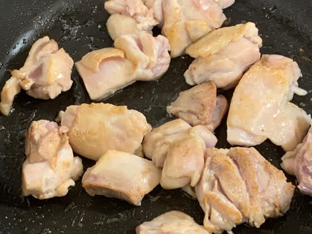 まずは鶏肉を塩胡椒で炒めて皮目に焼き色をつけてあげます